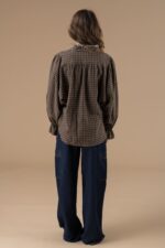 Cette chemise se distingue par ses broderies délicates : le col et le plastron sont rehaussés de motifs floraux raffinés qui créent un contraste poétique avec les carreaux géométriques.